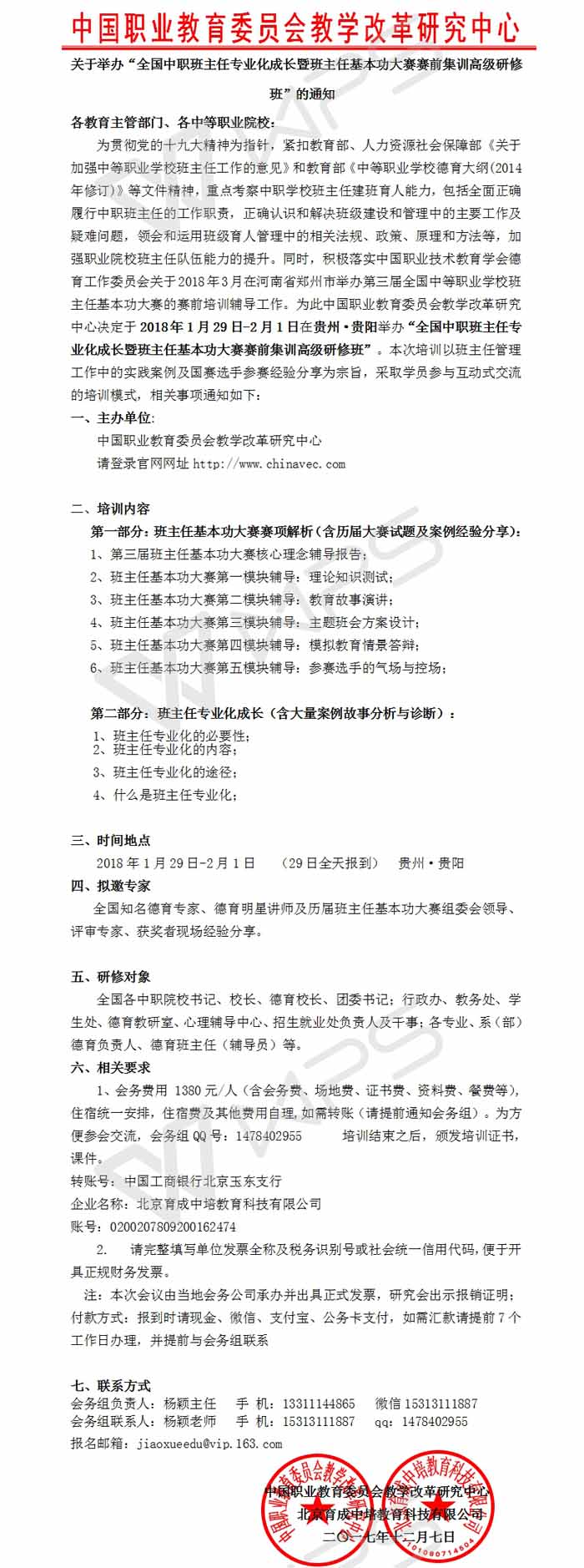 2018年1月29日贵阳关于举办“全国中职班主任专业化成长暨班主任基本功大赛赛前集训高级研修班”的通知