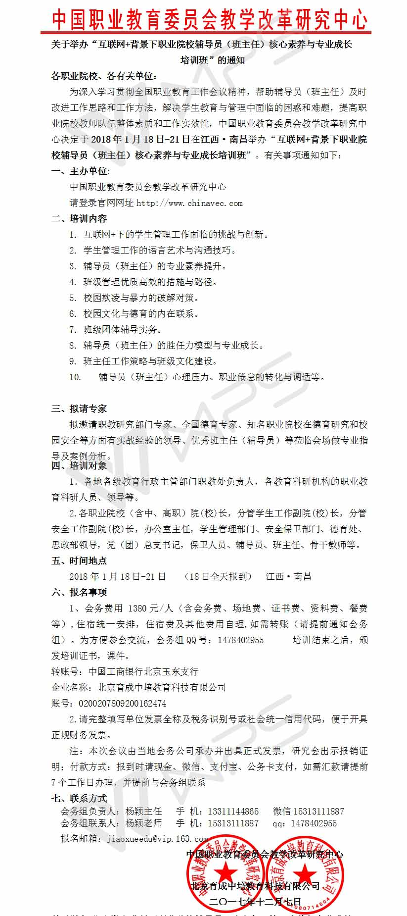 2018年1月18日南昌关于举办“互联网+背景下职业院校辅导员(班主任)核心素养与专业成长培训班”的通知