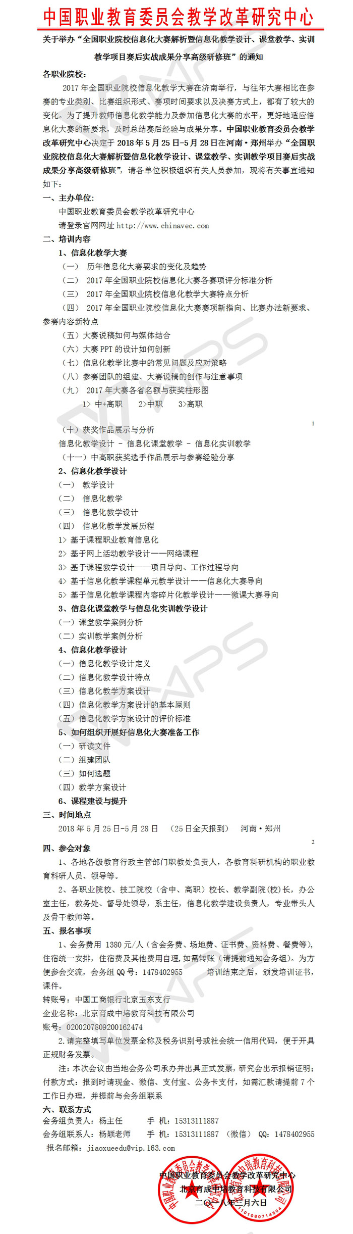2018年5月25日郑州关于举办“全国职业院校信息化大赛解析暨信息化教学设计、课堂教学、实训教学项目赛后实战成果分享高级研修班”的通知